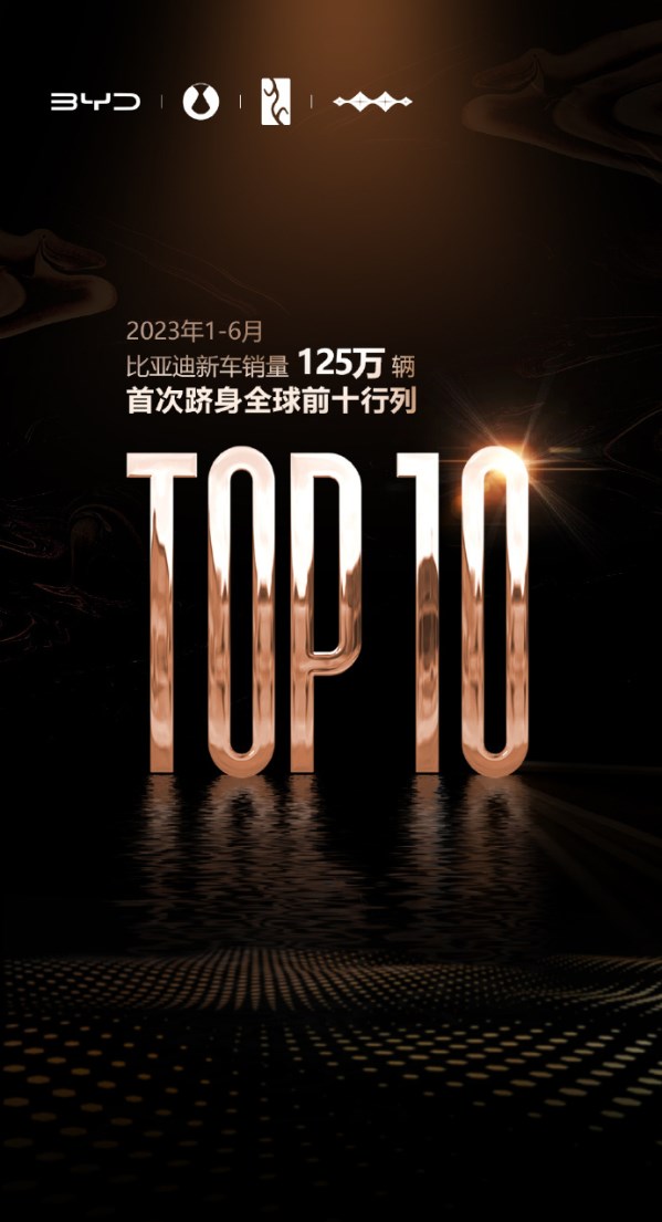 8月30日,比亞迪宣布,公司新能源汽車2023年1-6月銷量達到125萬輛,首次躋身全球前十行列。