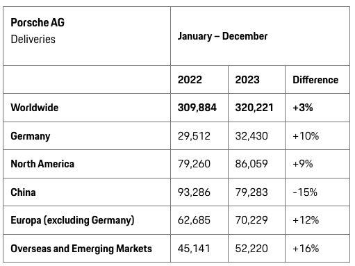 據(jù)保時(shí)捷公布的數(shù)據(jù),2023年保時(shí)捷911車型交付量同比增長(zhǎng)24%至50146輛,卡宴車型交付量同比降8%至87553輛。在全球范圍內(nèi),除了中國(guó)市場(chǎng)外,其他地區(qū)的交付量均實(shí)現(xiàn)了增長(zhǎng),尤其是在海外和新興市場(chǎng),銷量增長(zhǎng)了16%。